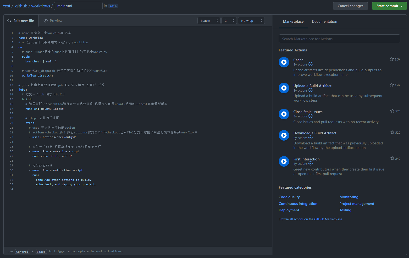Marketplace提供了一个Action市场Documentation提供了官方文档 - 编辑好后 点击右上角的